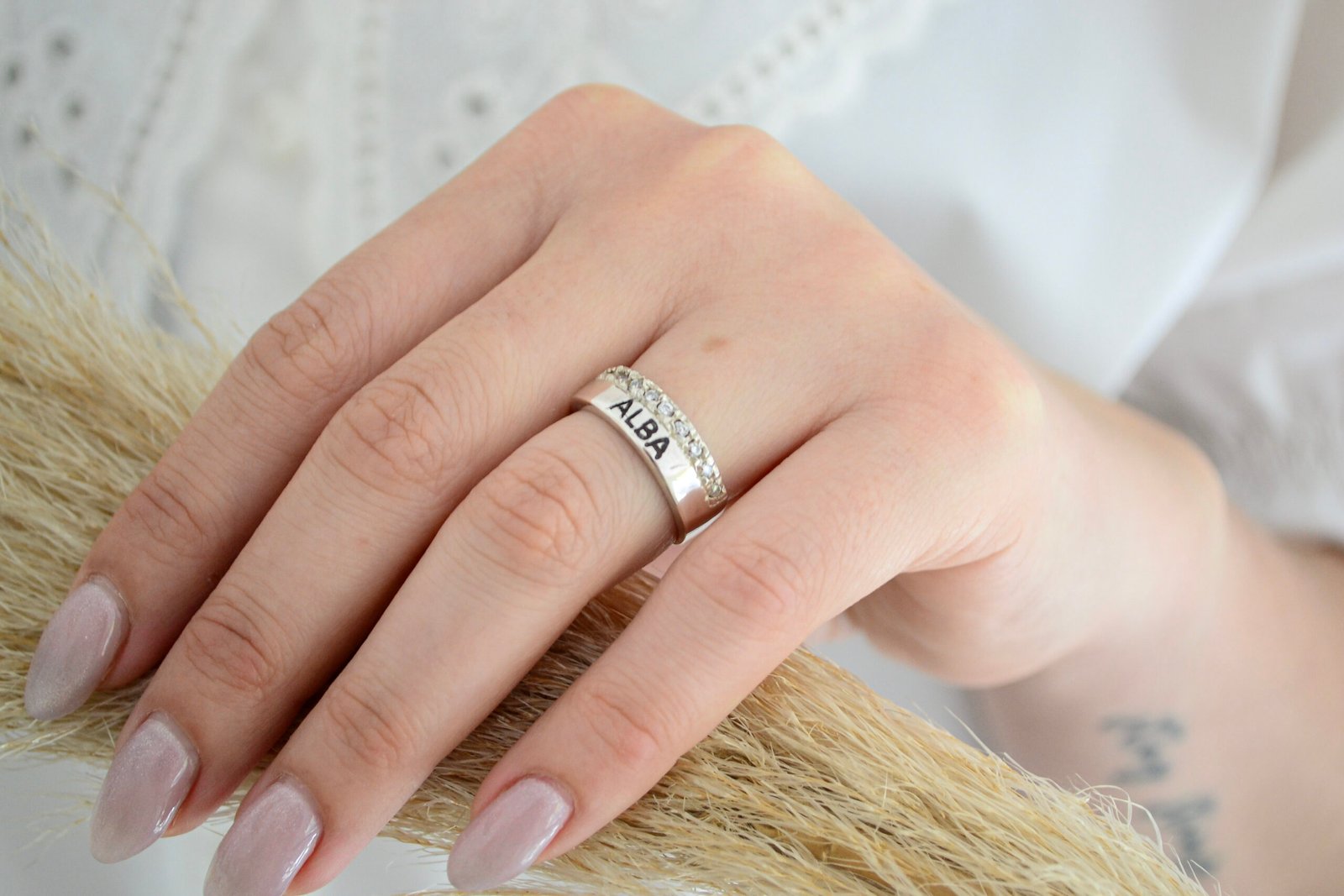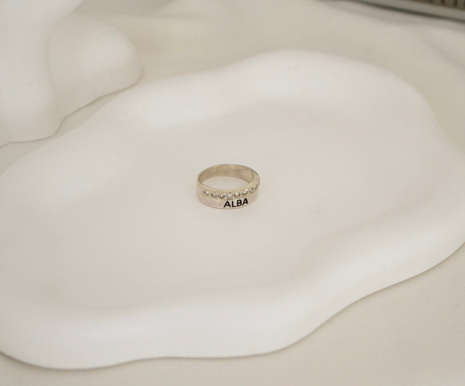 Anillo Cinta con detalle de Medio sin fin de Cùbics engarzados – Grabado Láser