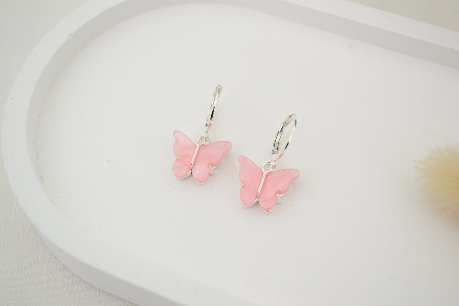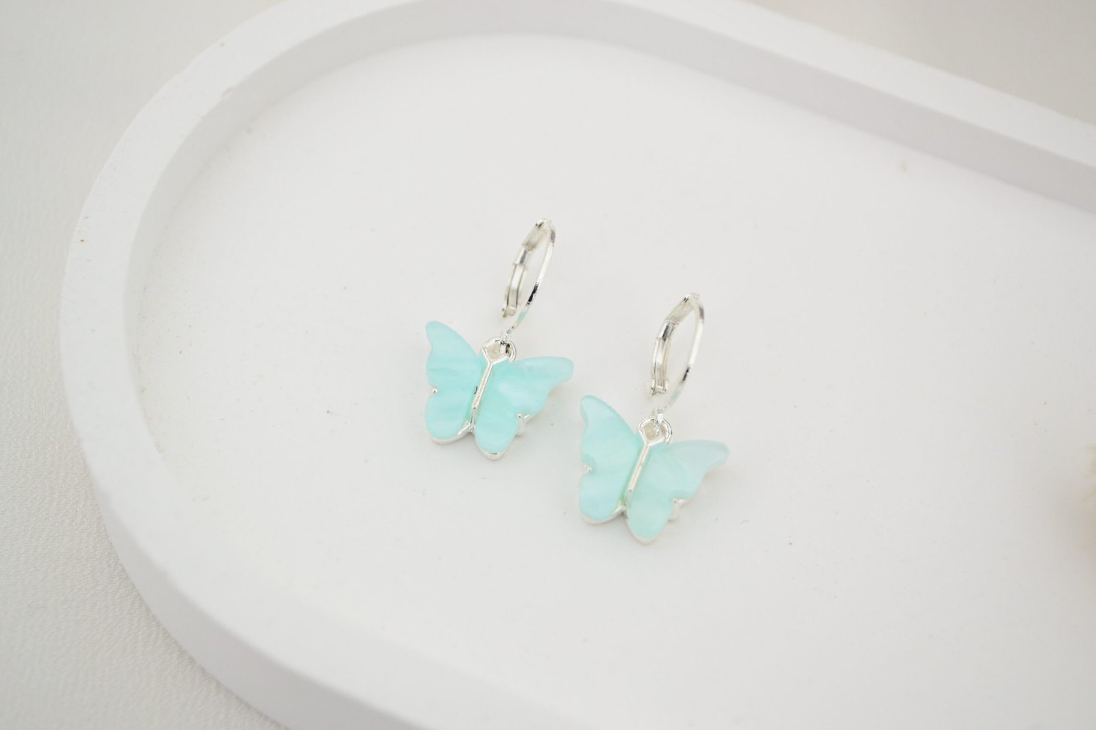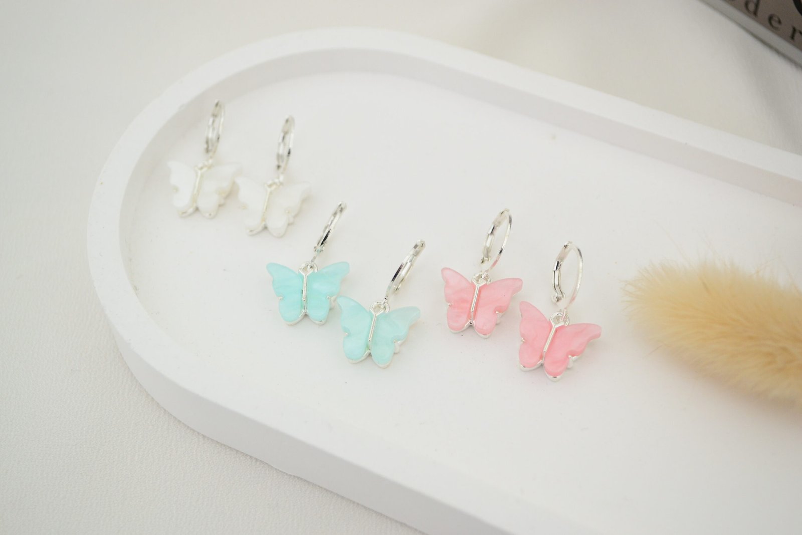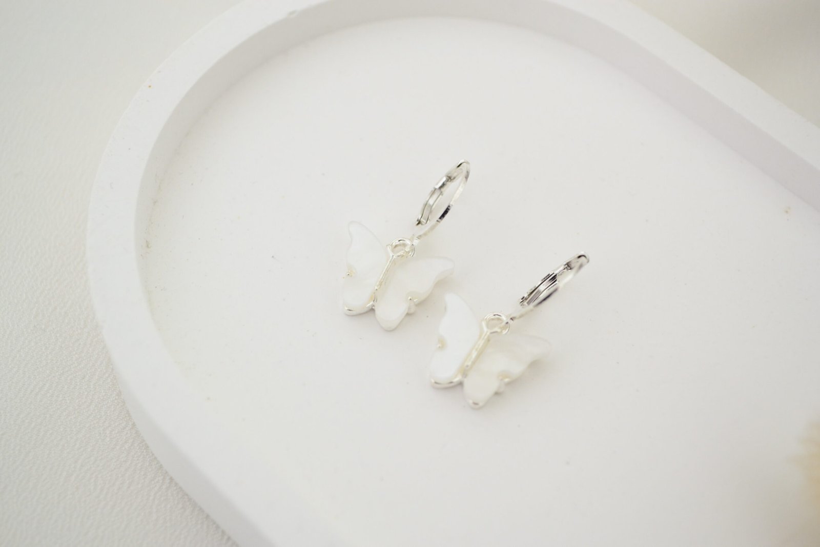 Aros Cierre Brisura Cerrada con Dije Colgante Mariposa Alas Simil Nácar – Acero Blanco