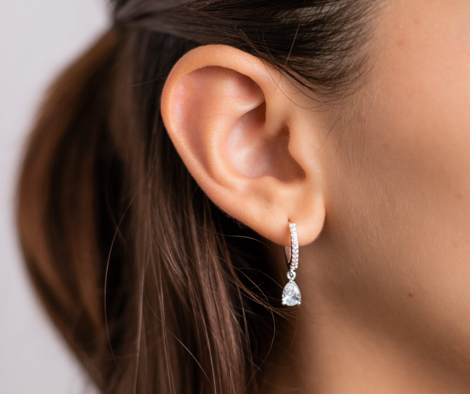 Confeccionados en plata 925, combinan un diseño de cierre huggie con micro cúbics engarzados y un dije colgante en forma de gota, logrando un brillo sutil pero encantador 💫